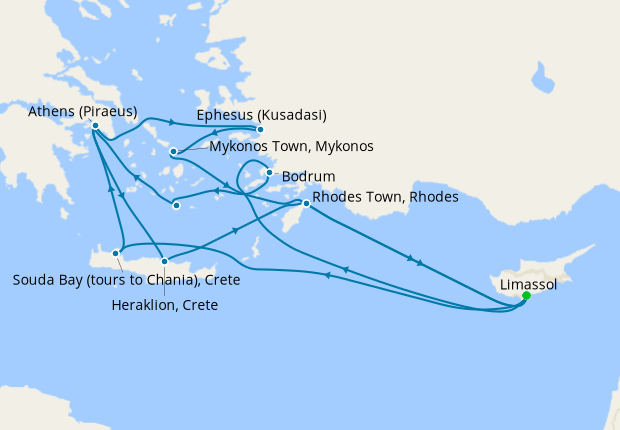 Rhodes Town comprises of an old and new town, each with their own unique charms. While the Old Town is like stepping back into the medieval ages, boasting Ottoman and Italian architecture, the New Town is a hub of vibrant nightlife. The combination of both old and new makes for a fantastically varied cruise holiday, catering to all interests. Explore an ancient palace and medieval ruins during the day, dine at an authentic seafood tavern in the evening, and dance the night away.