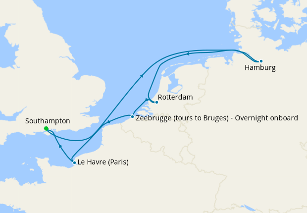 Zeebrugge (tours to Bruges) - Overnight onboard