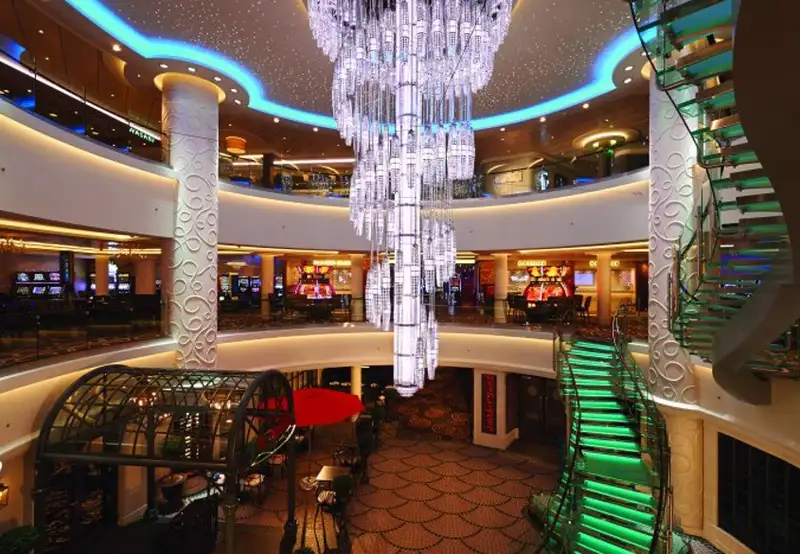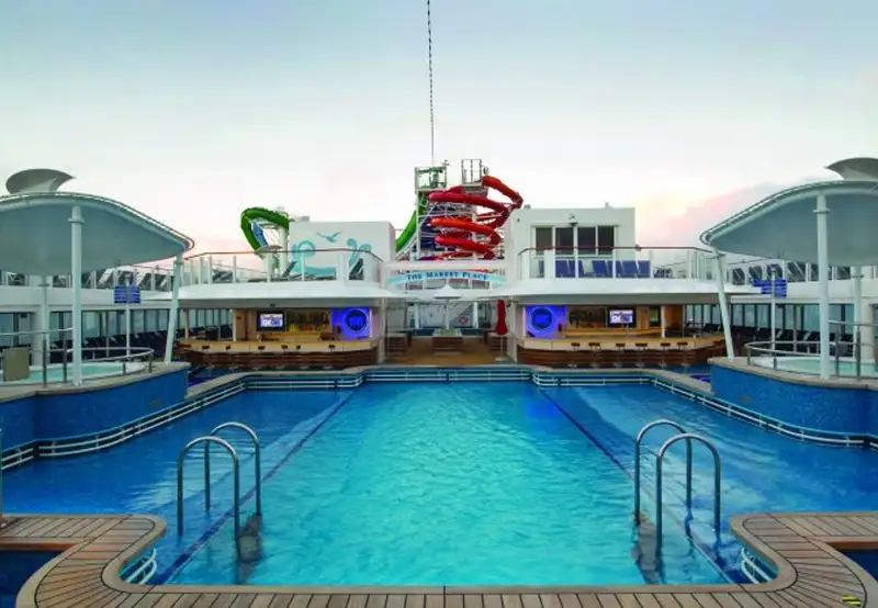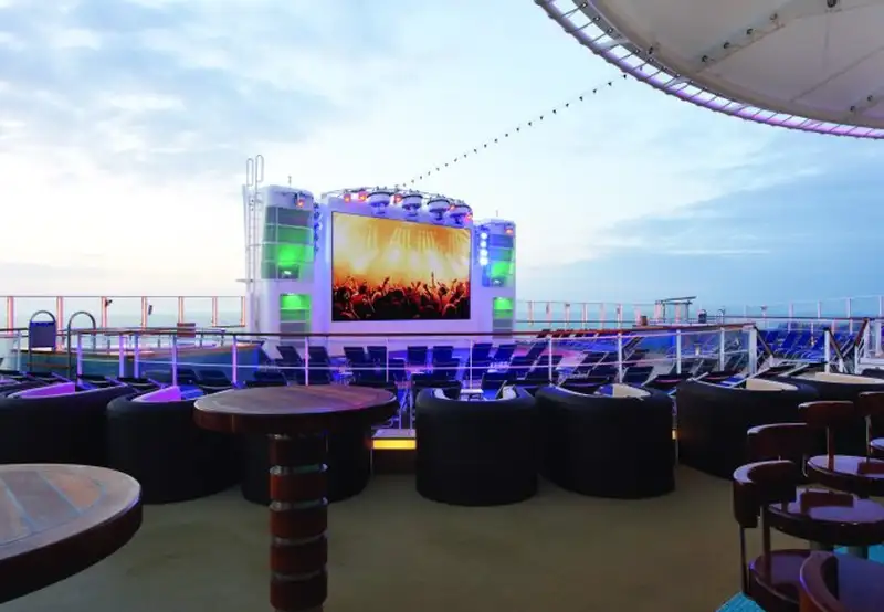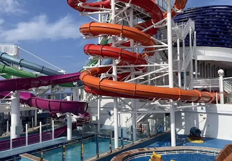Excellent choice of entertainment & restaurants. Loved the little extras such as virtual darts & skittles (small fee for these). The IceBar was fun to do and included two drinks per person (extra charge). Different to have O'Sheehan's bar open 24/7 for drinks & food rather than buffet (not open 24/7). Food in here was just as fresh & tasty at breakfast as it was at midnight. Plenty on tables free most of the time. Ate at three of the speciality dinning as part of our package - worth the extra, though not sure good value if paid onboard prices. Cabin was spacious - smallest balcony we've ever had, with just enough room for two small chairs & stool/table. Wardrobe was very close to side of the bed, leaving little room to access clothes/shoes stored in there. We are not fans of large ships for reasons such as tender bookings, disembarkation at ports, large queues for restaurants etc, though none of these were an issue. Use the app wisely and you'll usually manage to get show & restaurant bookings without any problem. Drinks onboard were well above average and made fresh to order. Pity the weather was wet and windy - would have loved to use the outdoor waterpark areas & climbing trail. Hot tubs and pool open when weather permitting.