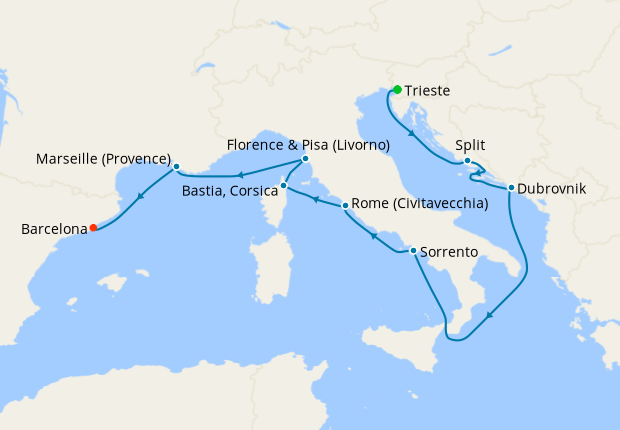 Mediterranean Glory from Trieste to Barcelona, 21 August 2027 (9 nights)