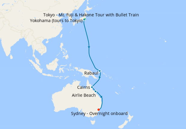 Day 5-21Cruise from Yokohama (tours to Tokyo) to Sydney - Overnight onboard