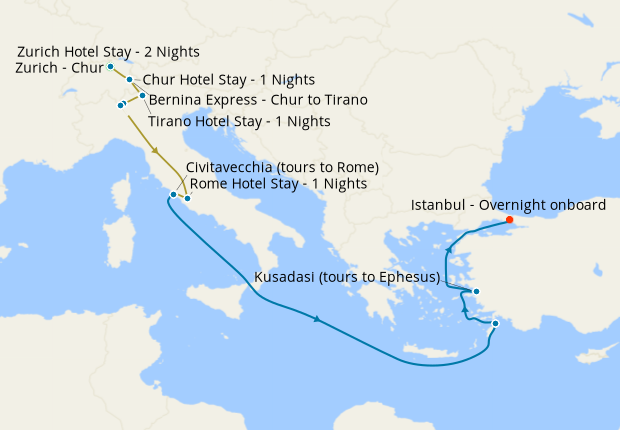 Swiss & Italian Rail Adventure inc. Bernina Express Train & Lake Como with Istanbul & Greek Islands from Civitavecchia, 13 September 2026 (15 nights)