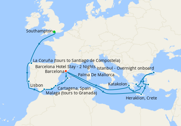 Mediterranean & Greek Islands from Southampton to Barcelona with Stay, 24 April 2026 (26 nights)